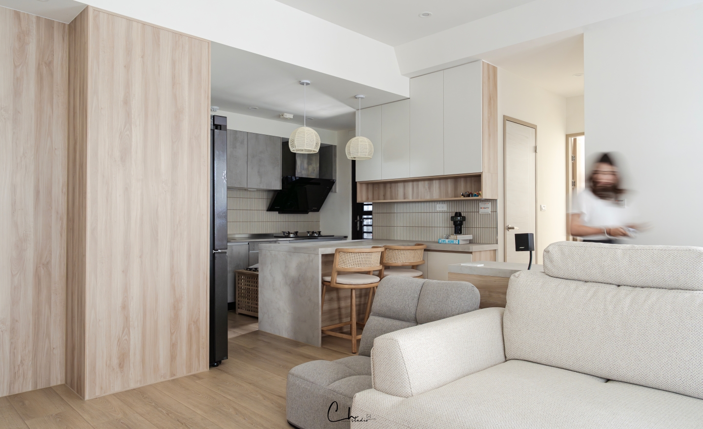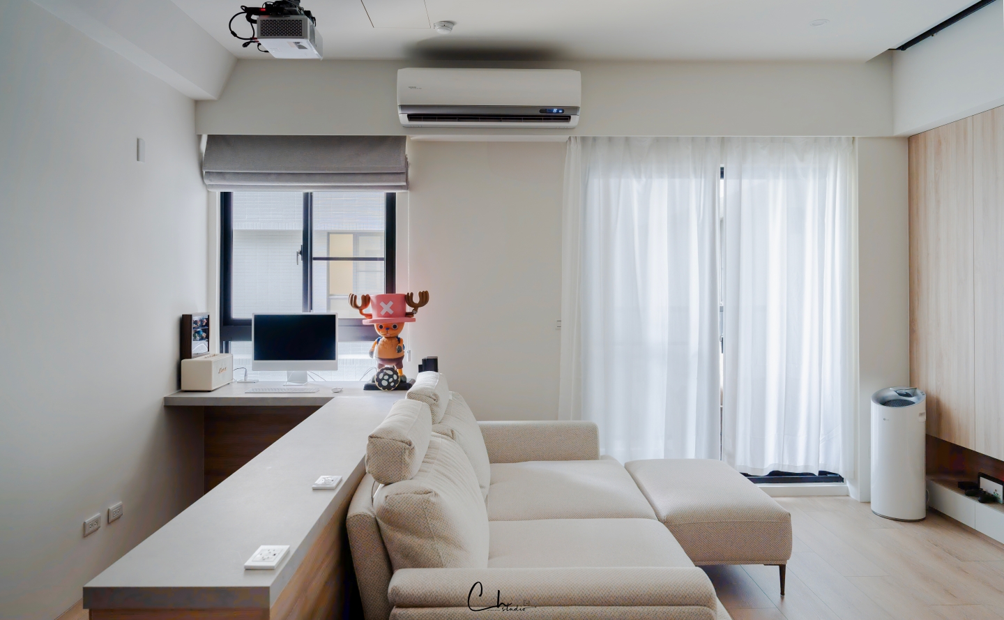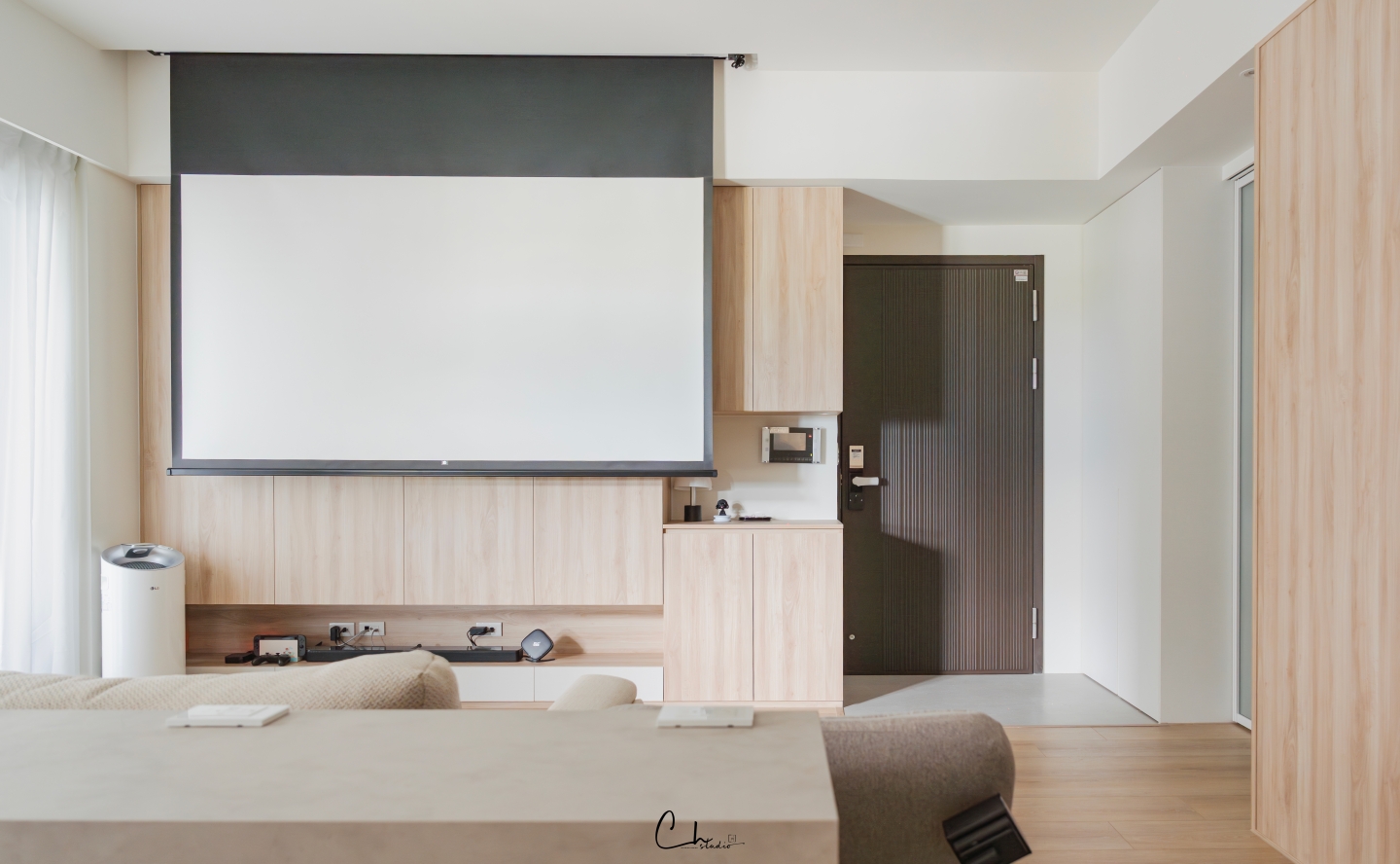 本次的設計著重於開放式客廳,我們捨棄了狹隘的書房隔間,並在家的心臟地帶,安放了可以沉靜思緒的角落,就算指尖在鍵盤上敲打著,也不會錯過空間的每一個流向,你不再錯過與愛人共度的每個瞬間,然而,這並不是分心,而是讓奮鬥的意義,時時刻刻都清晰可見。按業主的生活需求,這次也規劃了小宅流行的投影布幕,除了收納以外,牆,不必被螢幕佔據,我們讓投影機的光影,自由的灑落成一面柔軟的畫布,可以是週五夜晚,窩在懶骨頭裡的家庭電影院;也可以是業主放鬆的獨白,打開遊戲機放鬆靈魂,讓空間的運用更加鮮明。