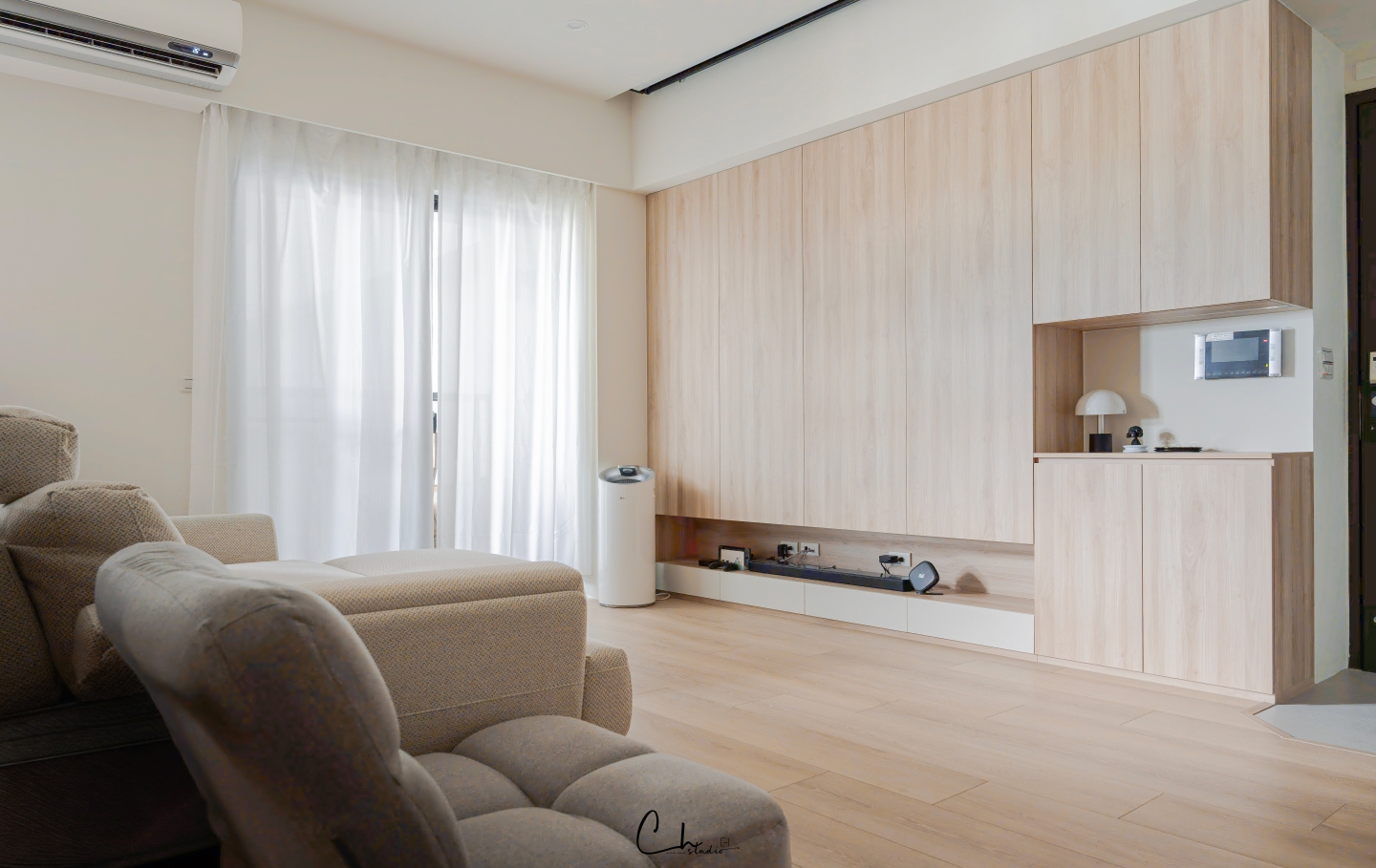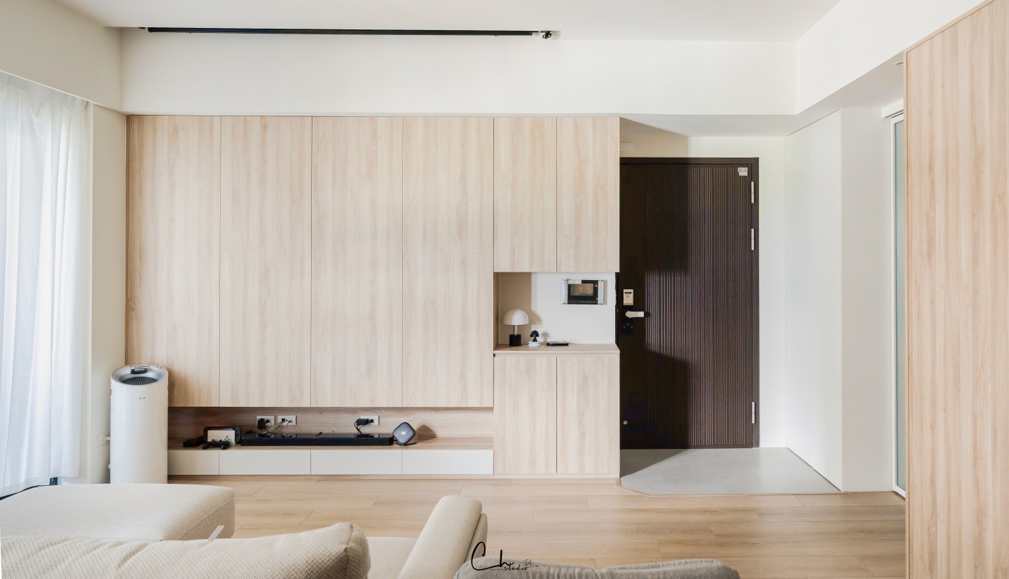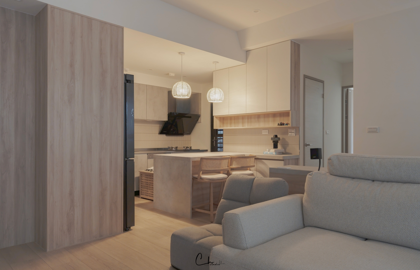本次的設計著重於開放式客廳,我們捨棄了狹隘的書房隔間,並在家的心臟地帶,安放了可以沉靜思緒的角落,就算指尖在鍵盤上敲打著,也不會錯過空間的每一個流向,你不再錯過與愛人共度的每個瞬間,然而,這並不是分心,而是讓奮鬥的意義,時時刻刻都清晰可見。按業主的生活需求,這次也規劃了小宅流行的投影布幕,除了收納以外,牆,不必被螢幕佔據,我們讓投影機的光影,自由的灑落成一面柔軟的畫布,可以是週五夜晚,窩在懶骨頭裡的家庭電影院;也可以是業主放鬆的獨白,打開遊戲機放鬆靈魂,讓空間的運用更加鮮明。