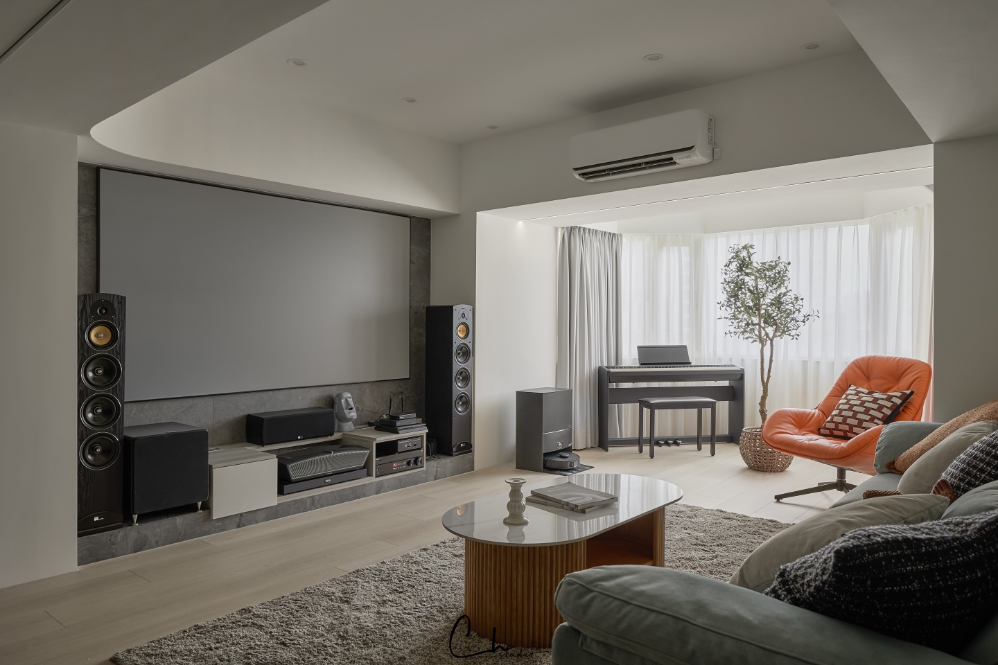 客廳主角不是電視,而是專業的短焦投影大螢幕與音響設備!搭配整合了強大收納機能的灰色系系統櫃與鐵件展示架,打造專屬一家人的影音娛樂空間。