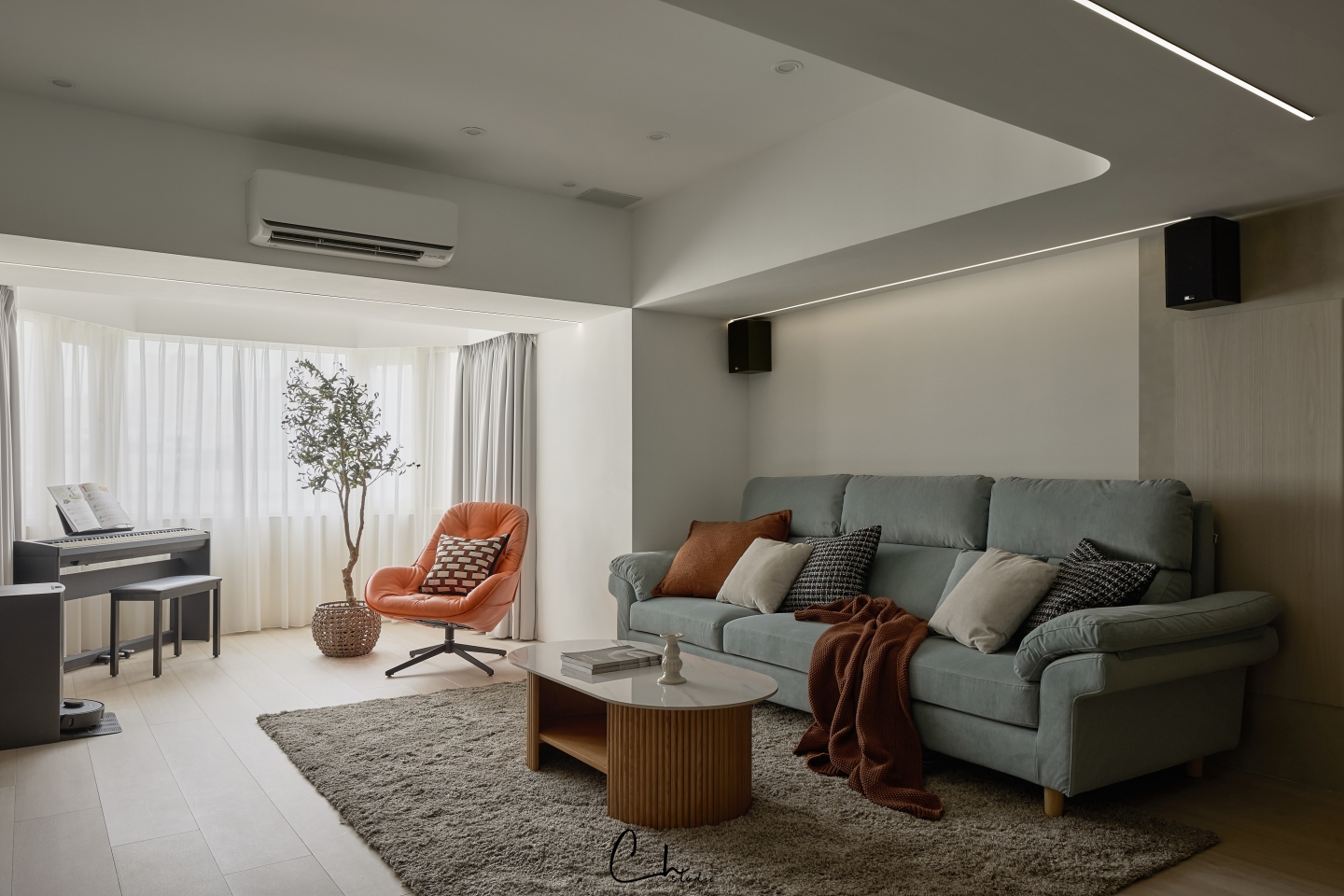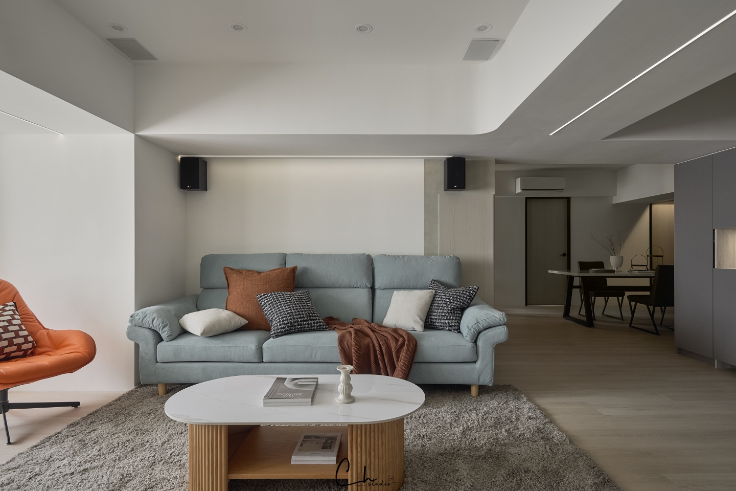 針對老屋常見的巨大樑柱與低矮樓高,我們以柔美的圓弧線條包覆修飾,視覺往上延伸,空間感瞬間放大。