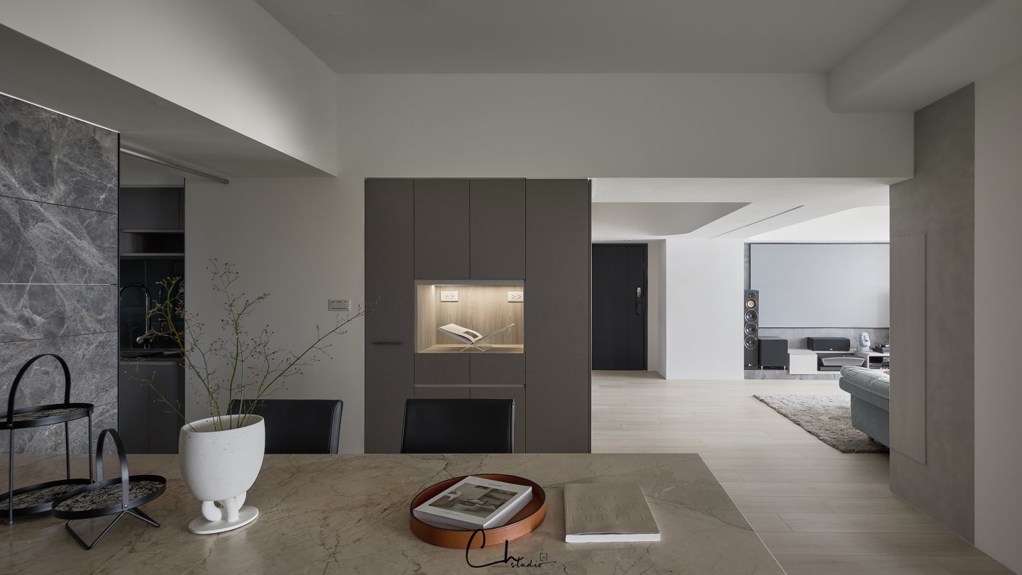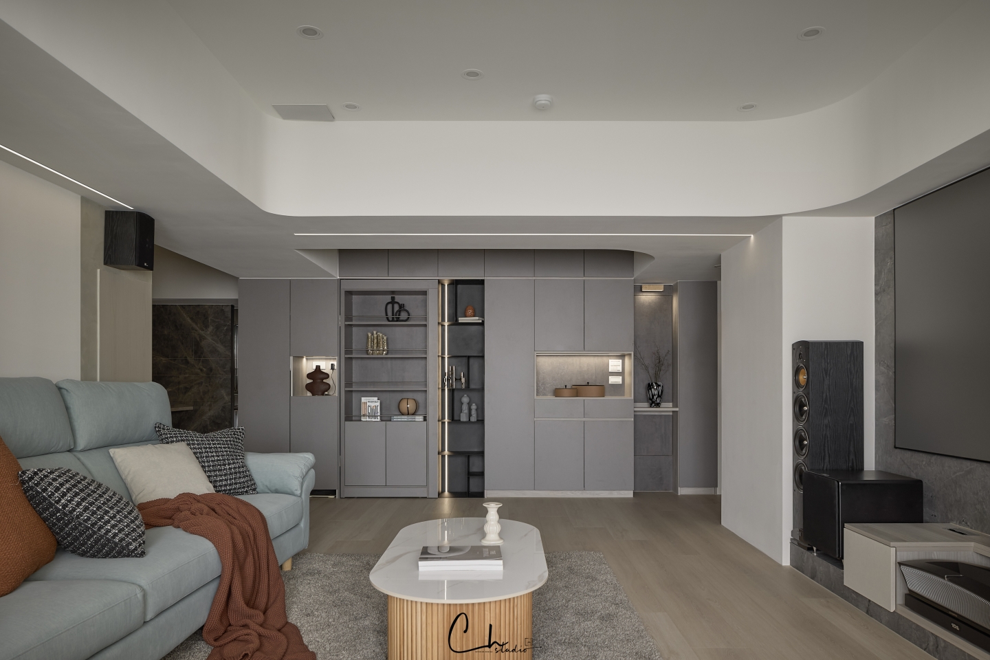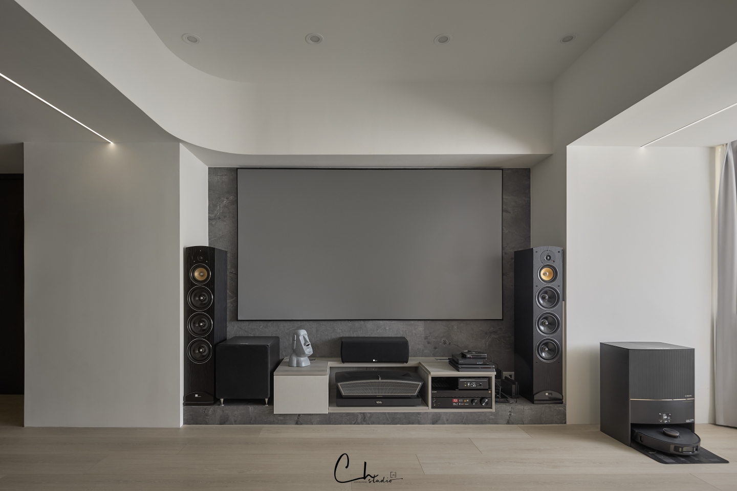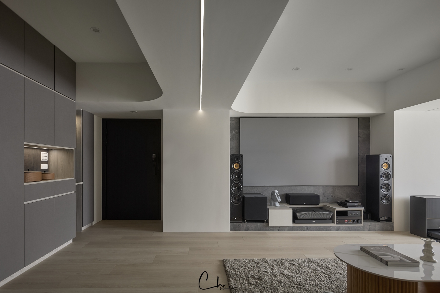 家的核心——客廳,我們大膽地用 短焦投影機 取代傳統電視,打造出沈浸感十足的家庭劇院,完美融合了業主珍藏的專業音響設備,讓聲光饗宴成為日常。收納,更是改造的關鍵!我們選用沉穩的灰色系 系統櫃,結合俐落的黑色鐵件展示架,並將儲藏室的入口「藏」了起來,創造出乾淨完整的牆面,既實用又美觀。