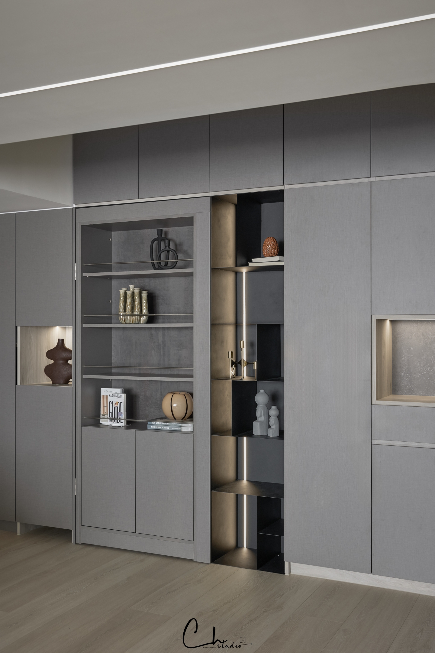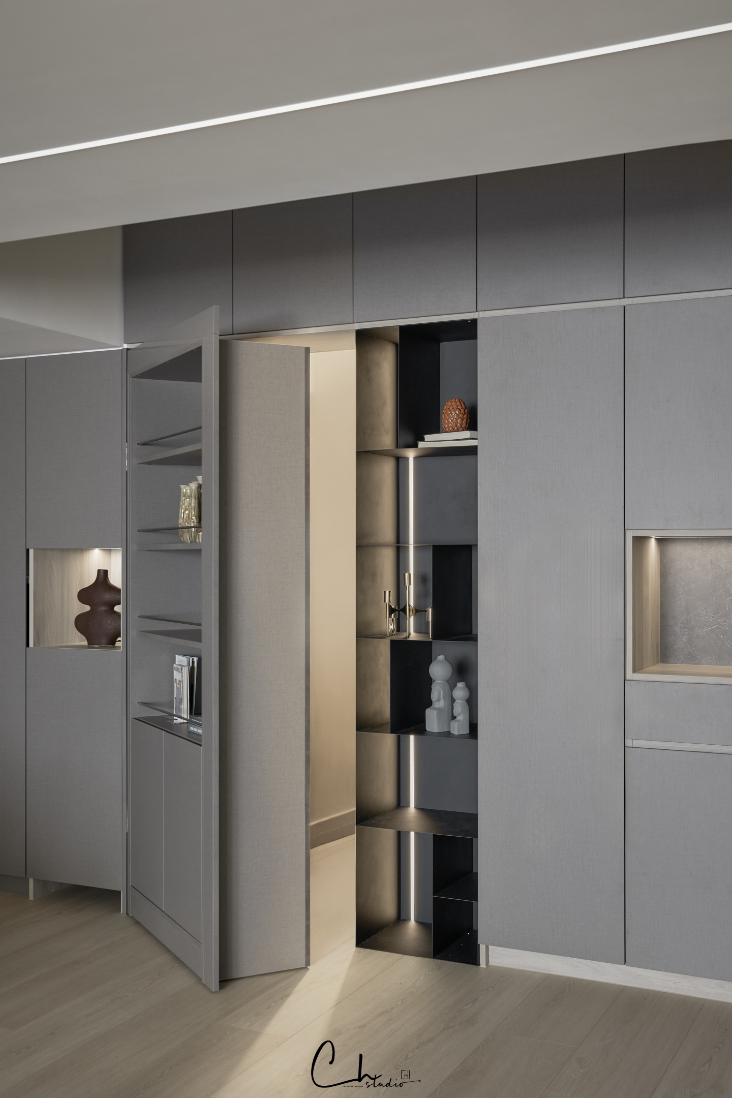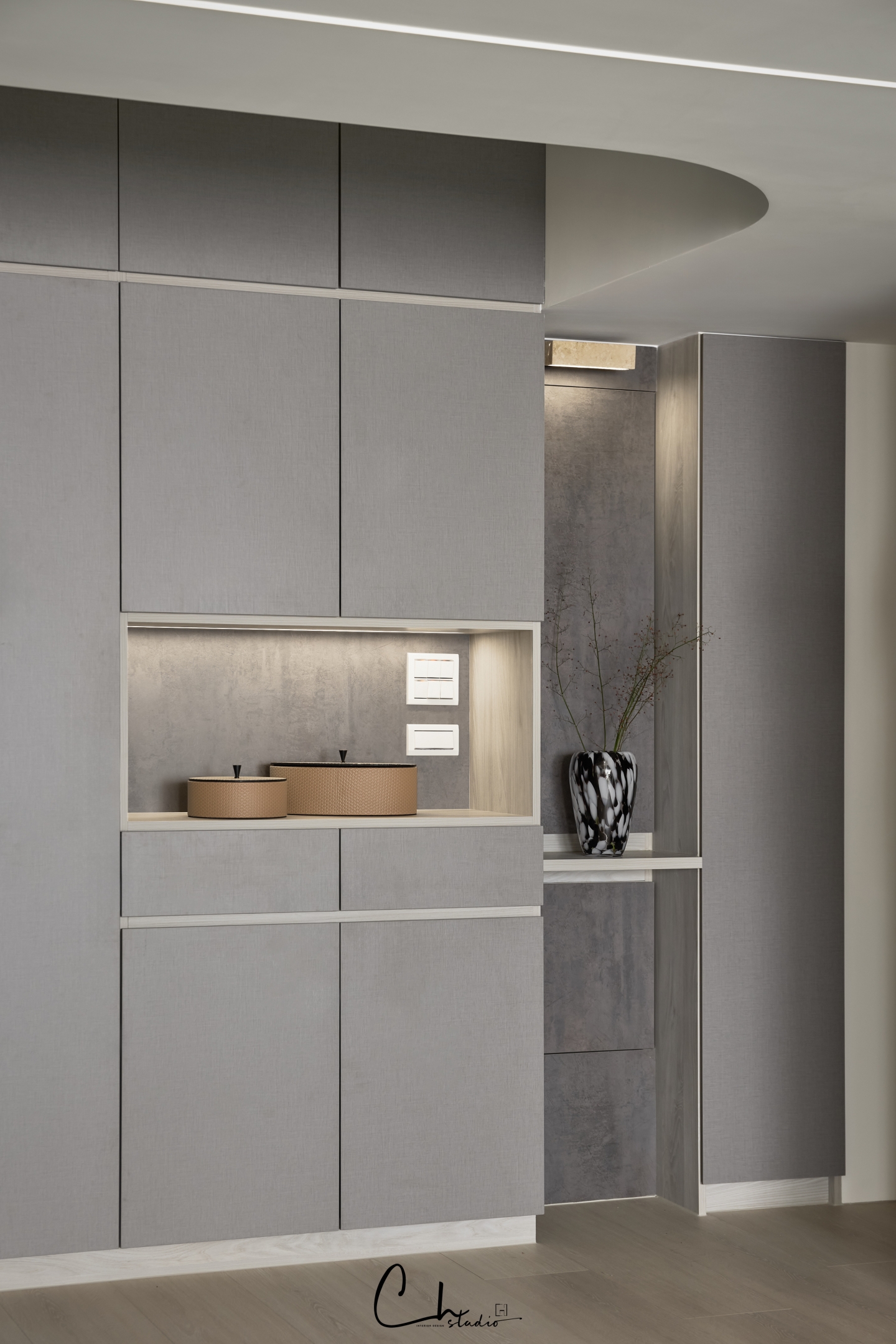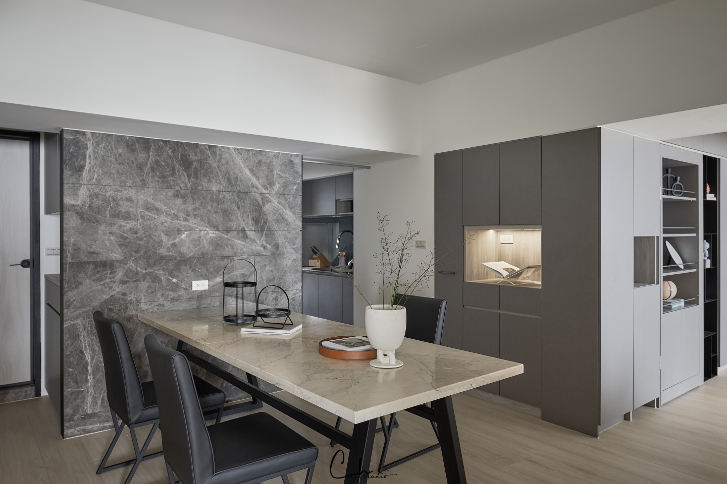 家的核心——客廳,我們大膽地用 短焦投影機 取代傳統電視,打造出沈浸感十足的家庭劇院,完美融合了業主珍藏的專業音響設備,讓聲光饗宴成為日常。收納,更是改造的關鍵!我們選用沉穩的灰色系 系統櫃,結合俐落的黑色鐵件展示架,並將儲藏室的入口「藏」了起來,創造出乾淨完整的牆面,既實用又美觀。